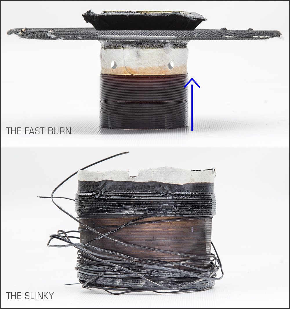 Voice coils come in two flavors of traditional burn, fast and slow. The Fast Burn is easily characterized by a gradient in the coil. The bottom of the voice coil is black while the top may still be nice a copper color. In the world of roasted coils the Fast Burn is the middle of the pack for too much power for too long. This coil also typically rattles, but this isn’t a former rubbing on the pole piece. Instead, the Fast Burn is when the windings rub and bang against each other. As the resins melt, they do so more evenly than the Rattle. Gases are allowed to escape from the inner layers of the voice coil, you may even notice small resin bubbles form on the gaps between the windings as the resin boils. When the power is decreased even more and played for even longer, we get the classic thermal failure. This is the Slow Burn or as it’s more popularly known, the Slinky.