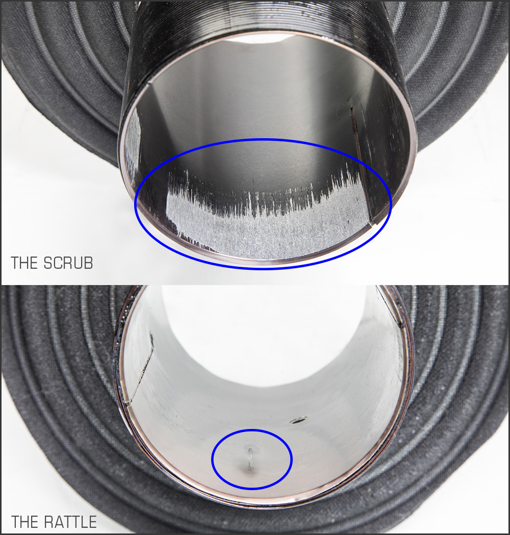 The Rattle is easy to distinguish from its cousin, the Scrub. The Scrub is a result of mechanical failure, non-linearities and the woofer spider’s inability to keep the voice coil straight up-and-down in the magnetic gap. The Scrub leaves a wide arc of rub marks across the former, whereas the Rattle typically only affects the top of the gas bubble point.